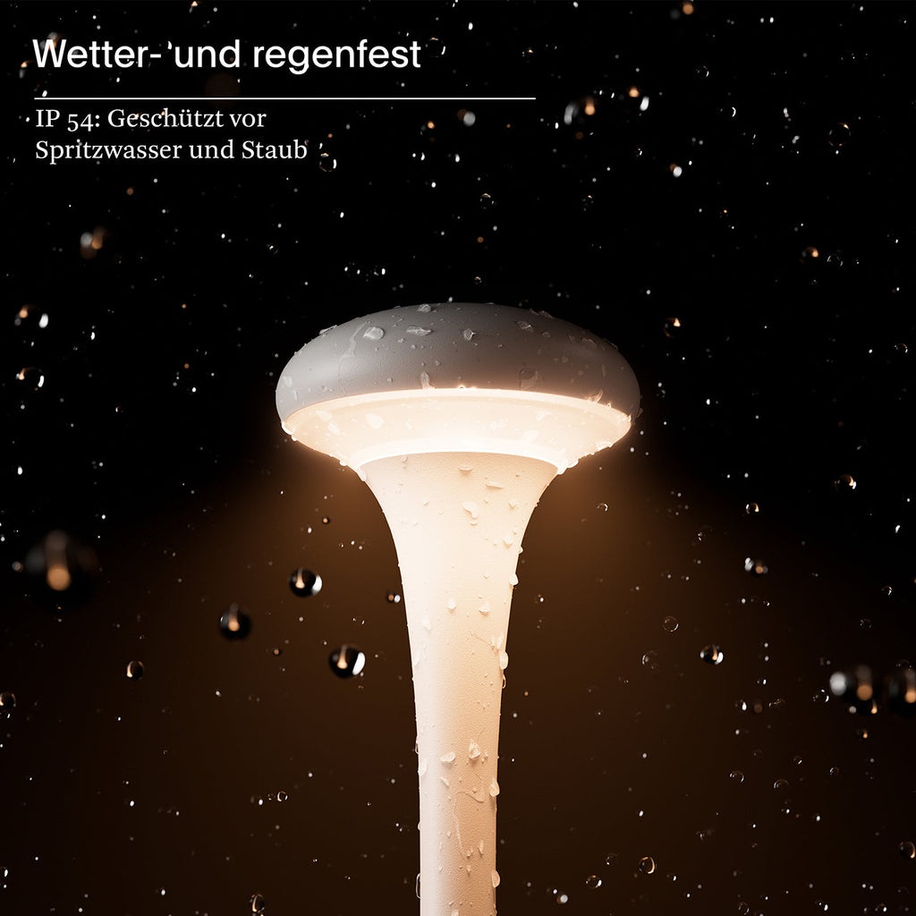 Innen & Außen: Die dimmbare Akku-Tischleuchte für den Wohn- und Außenbereich hält dank Schutzart IP54 (spritzwassergeschützt) auch Regenschauer aus.