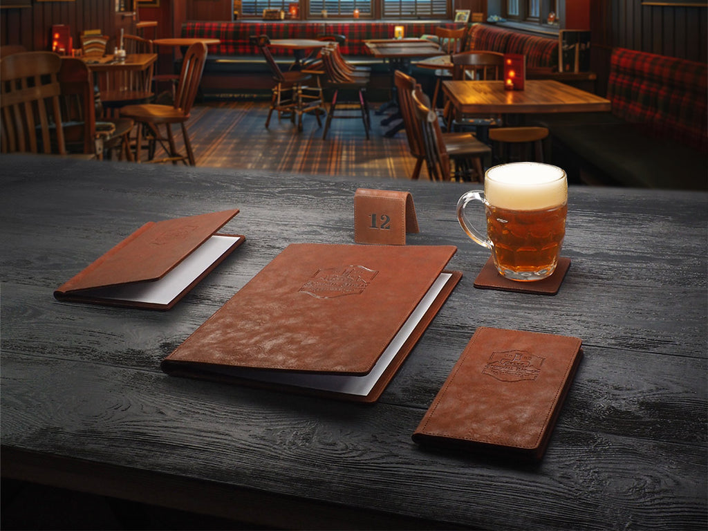 Tischaufsteller aus Kunstleder – kompakt, edel & personalisierbar